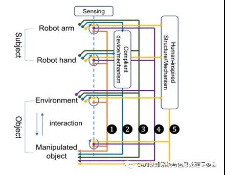 文章介紹了G精度機器人操控的五類方法:(1)基于傳感信息的方法(2)基于柔順機構的方法(3)基于環境約束的方法(4)基于感知約束集成的方法(5)仿生的方法。如圖1所示,示意圖展示了五類方法之間的差異。在機器人操控中,主體是機器人的手臂和手,客體是環境和被操控的對象。虛線表示傳感信息,回路表示傳感器感知到的新狀態。