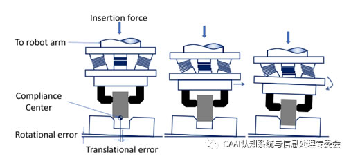 RCC是由Whitney和Nevins發明的,用于幫助機器人完成插入和裝配任務[41]。在他們的研究中,他們廣泛地討論了機器人的插入過程[42]。在插入過程中,銷釘會在軸向旋轉夾持器下傾斜,這稱為柔性中心。如圖3所示,RCC裝置實際上是一個有6個自由度的彈性機構,可以改變系統柔度中心的位置。在[43]中開發了一種具有計算機可調阻抗的主動柔性末端執行器。目前,將RCC與其他設備或控制方法相結合是非常有研究價值的課題。