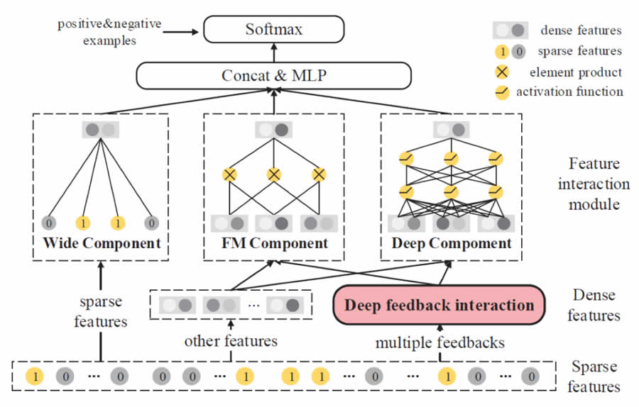 為了解決這些問題,綜合使用用戶多種顯式/隱式和正/負(fù)反饋信息學(xué)習(xí)更好的無偏用戶表示,作者提出了一個(gè)Deep Feedback Network (DFN)模型。圖1中給出了在微信看一看場(chǎng)景中的三種用戶反饋。DFN通過internal feedback interaction component抓住用戶行為序列中的細(xì)粒度行為J別的交互,然后通過external feedback interaction component,使用準(zhǔn)確但稀少的隱式正反饋和顯式負(fù)反饋?zhàn)鳛楸O(jiān)督,從噪音較多的隱式負(fù)反饋中進(jìn)一步抽取用戶的正負(fù)反饋信息。這些反饋特征會(huì)和其他用戶/物品特征混合,并行使用FM、Deep和Wide層進(jìn)行特征交互,后進(jìn)行CTR預(yù)估。