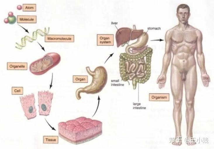 通過上一節(jié)的介紹我們也了解到,深度學(xué)習(xí)的黑箱性主要來源于其G度非線性性質(zhì),每個神經(jīng)元都是由上一層的線性組合再加上一個非線性函數(shù)的得到,我們無法像理解線性回歸的參數(shù)那樣通過非常solid的統(tǒng)計學(xué)基礎(chǔ)假設(shè)來理解神經(jīng)網(wǎng)絡(luò)中的參數(shù)含義及其重要程度、波動范圍。但實際上我們是知道這些參數(shù)的具體值以及整個訓(xùn)練過程的,所以神經(jīng)網(wǎng)絡(luò)模型本身其實并不是一個黑箱,其黑箱性在于我們沒辦法用人類可以理解的方式理解模型的具體含義和行為,而神經(jīng)網(wǎng)絡(luò)的一個非常好的性質(zhì)在于神經(jīng)元的分層組合形式,這讓我們可以用物質(zhì)組成的視角來理解神經(jīng)網(wǎng)絡(luò)的運作方式。比如如下圖所示,人體的組成過程是從分子-細(xì)胞-組織-器官-系統(tǒng)-人體: