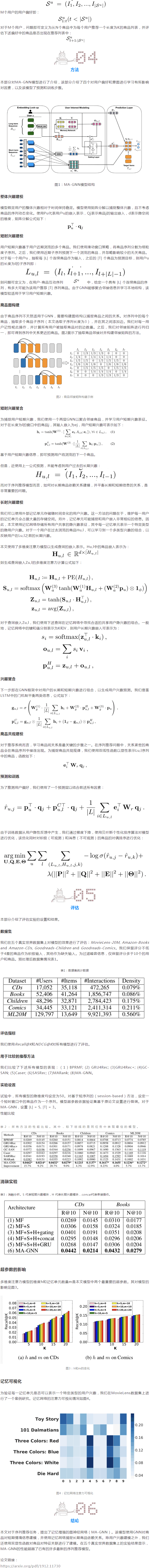 這一結(jié)構(gòu)能夠捕捉較短時(shí)期的情境信息和結(jié)構(gòu)。為了對(duì)用戶的長期興趣建模,我用使用一個(gè)鍵值記憶網(wǎng)絡(luò)(key-value memory network)以基于用戶的長期商品序列形成對(duì)用戶興趣的表征。通過該方法,在推薦一個(gè)商品時(shí),其他具有相似偏好的用戶也會(huì)成為影響因素。為了綜合用戶的長期和短期興趣,我們?cè)贕NN框架中引入了門機(jī)制,和LSTM網(wǎng)絡(luò)中的門機(jī)制類似。這一機(jī)制對(duì)長時(shí)和短時(shí)興趣在模型中的貢獻(xiàn)度進(jìn)行控制。在商品共現(xiàn)模塊中,我們使用了一個(gè)雙線性函數(shù)以捕捉商品序列中G度相關(guān)的商品。我們?cè)谖鍌(gè)真實(shí)世界的數(shù)據(jù)集上對(duì)模型進(jìn)行了評(píng)估,并使用一系列評(píng)估指標(biāo),和多個(gè)當(dāng)前先進(jìn)的模型進(jìn)行了對(duì)比。試驗(yàn)結(jié)果顯示了本文模型相較于其他模型在推薦效果上的提升,并展示了上述模塊的有效性。