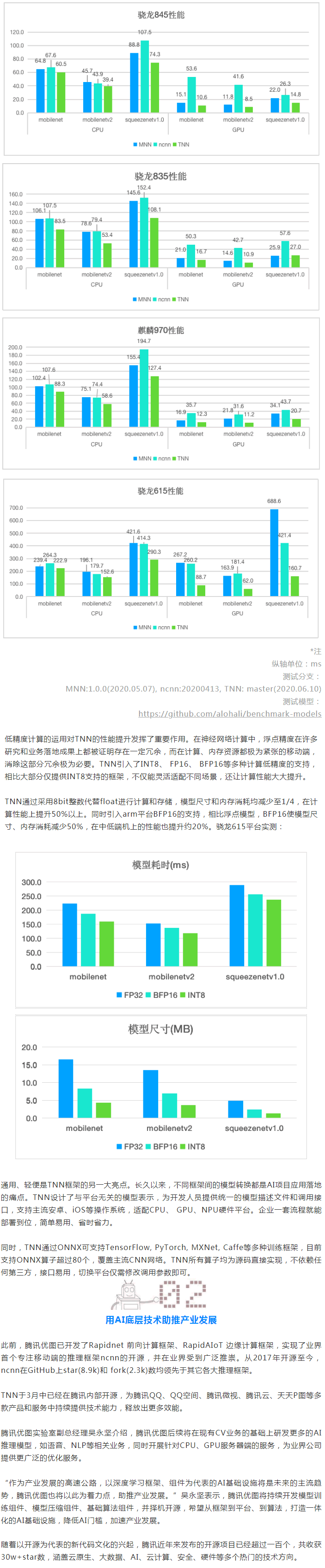 6月10日,騰訊優(yōu)圖實驗室宣布正式開源新一代移動端深度學(xué)習(xí)推理框架TNN,通過底層技術(shù)優(yōu)化實現(xiàn)在多個不同平臺的輕量部署落地,性能優(yōu)異、簡單易用。騰訊方面稱,基于TNN,開發(fā)者能夠輕松將深度學(xué)習(xí)算法移植到手機端G效的執(zhí)行,開發(fā)出人工智能 App,真正將 AI 帶到指尖。