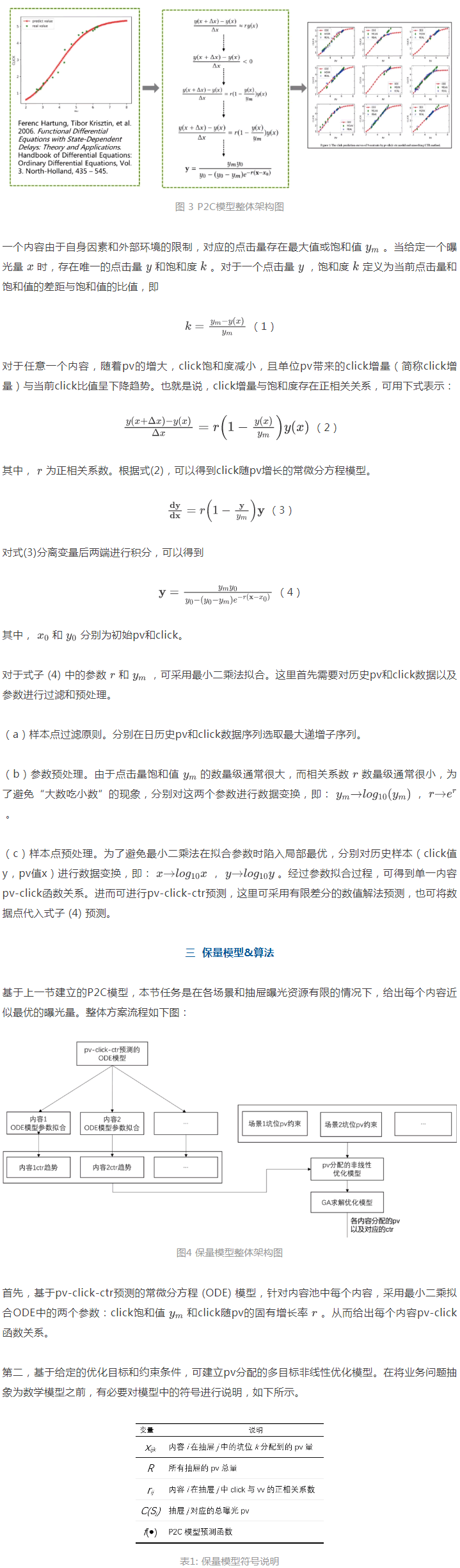 為內(nèi)容分配曝光量涉及到關(guān)于曝光和點(diǎn)擊建模問題,以及內(nèi)容的未來點(diǎn)擊量預(yù)測問題。內(nèi)容曝光、點(diǎn)擊和播放等構(gòu)成了一個(gè)復(fù)雜的非線性混沌系統(tǒng),不僅取決于內(nèi)容質(zhì)量本身,也取決于內(nèi)容更新時(shí)間、更新策略和用戶點(diǎn)擊習(xí)慣等。傳統(tǒng)的統(tǒng)計(jì)預(yù)測模型無法闡述外部環(huán)境的各種干擾因素以及系統(tǒng)的混沌特性,即無法從機(jī)理上描述系統(tǒng)本質(zhì)。針對此問題,我們先通過分析新熱內(nèi)容的歷史曝光點(diǎn)擊日志,使用常微分方程建立了新熱內(nèi)容曝光敏感模型,即pv-click-ctr模型(簡稱P2C模型)。在P2C模型基礎(chǔ)上,結(jié)合各場景和抽屜的曝光資源約束,給出一種曝光資源約束下的多目標(biāo)優(yōu)化保量框架與算法。
