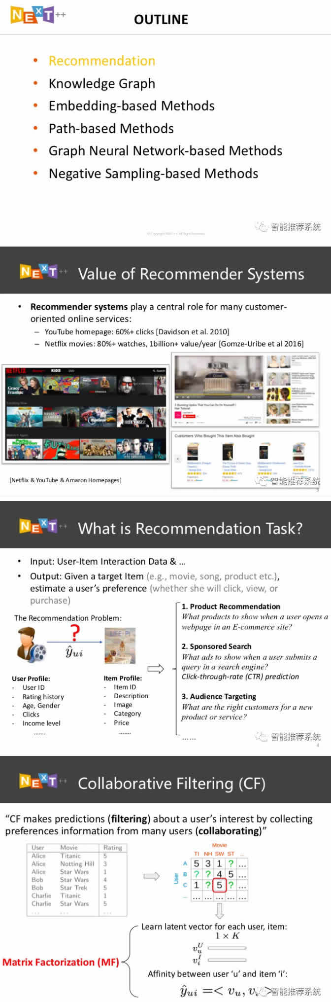 今天給大家?guī)硇录悠聡?guó)立大學(xué)NExT中心的王翔博士在2020年5月10日舉辦的“推薦系統(tǒng)前沿進(jìn)展”系列學(xué)術(shù)沙龍活動(dòng)中所做的分享《當(dāng)個(gè)性化推薦遇上知識(shí)圖譜》,在本次分享中,王翔簡(jiǎn)要分析了知識(shí)圖譜在個(gè)性化推薦L域的應(yīng)用背景,并詳細(xì)介紹了課題組在個(gè)性化推薦中的相關(guān)研究技術(shù)和進(jìn)展,包括基于路徑、基于表征學(xué)習(xí)、基于圖神經(jīng)網(wǎng)絡(luò)等知識(shí)圖譜在推薦系統(tǒng)中的融合技術(shù)。