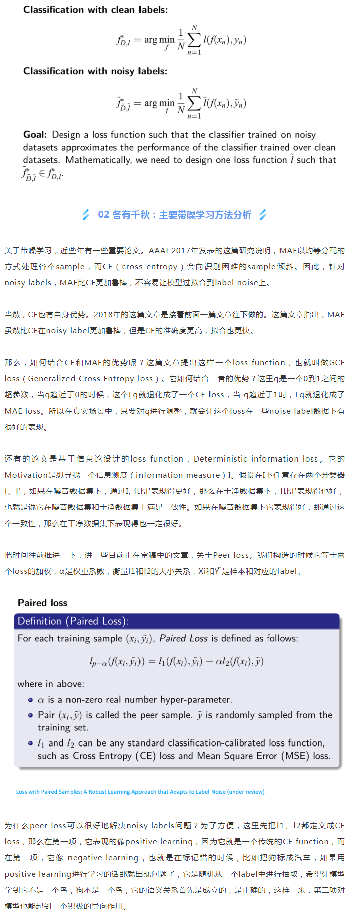 噪音普遍存在,所以我們需要訓(xùn)練神經(jīng)網(wǎng)絡(luò)進(jìn)行帶噪學(xué)習(xí),并且要能實(shí)現(xiàn)比較好的性能。那么noise label learning的目標(biāo)是設(shè)計(jì)一個(gè)loss function,使得在noisy labels下訓(xùn)練得到的解,在性能上接近在clean labels下訓(xùn)練得到的解。