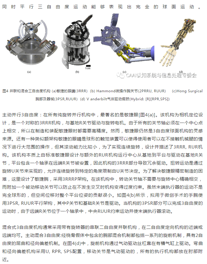 串行RRR方法在工業機械臂應用中非常普遍。許多商用工業武器,如Kuka k -16、川崎k系列、發那科M系列、DurrEcoPaint、鴻海/ Foxconnrobot arms和巴雷特WAM[圖2(b)]。這三個關節的軸在一個共同點上相交球形末端執行器運動,并為機器人手臂更近端的關節提供平移運動與球形手腕運動解耦。當兩個“滾”軸共線時,這種設計常常導致在零位置出現奇異點。然而,在包裝約束的運動范圍和靈活性(輥電機和齒輪系可以放置遠離旋轉中心)使這種配置吸引和適合工業武器。要注意的是,這些臂內的俯仰和其中一個滾轉角通常是通過傘齒輪差速器驅動的,這使得電機可以沿著腕關節的縱向放置,節省空間,并可能減少轉動慣量。滾-槳-滾設計也用于類人機器人、用于衛星服務的機器人手臂和外科機器人手腕,代替使用第二列滾動關節,一些手腕設計實現3自由度的運動通過滾動-傾斜-偏航配置。在這種情況下,偏航軸垂直于橫搖軸和俯仰軸,對應于人手腕的徑向偏差。當偏航軸與俯仰軸和滾轉軸相交時,該機構通常被認為是一個球形腕關節,也可以被認為是一個RU鏈。除了手術臂和工業臂,因為滾-滾-滾手腕與人的手腕相似,所以也經常用于人形或擬人化機械臂。一些系列腕設計選擇使用單一的球關節而不是串行鏈,雖然整體幾何形狀是一個球和窩接接頭,但球實際上是轉子,窩接接頭是定子。