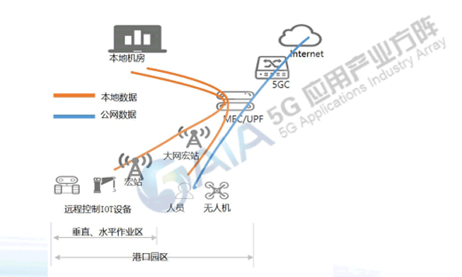 案例整體采用SA組網(wǎng),在港口區(qū)域部署大網(wǎng)宏站和專用宏站,提供港口生產(chǎn)業(yè)務(wù)的頻率專用服務(wù),通過(guò)接入控制方案保障其它用戶無(wú)法接入專網(wǎng)小區(qū),大大增強(qiáng)其業(yè)務(wù)性能(如時(shí)延、可靠性、速率)保障效果;目前已完成多個(gè)堆場(chǎng)連續(xù)覆蓋,滿足港口對(duì)速率、時(shí)延、可靠性、安全隔離等方面需求。核心網(wǎng)部署專用5GC核心網(wǎng)切片,將UPF下沉至港口區(qū),保障港口敏感 業(yè)務(wù)的數(shù)據(jù)安全隔離性,其余核心網(wǎng)設(shè)備位于運(yùn)營(yíng)商機(jī)房,物理設(shè)備與其他項(xiàng)目共享,通過(guò)切片進(jìn)行虛 擬隔離。港機(jī)PLC等港口設(shè)備通過(guò)CPE接入5G網(wǎng)絡(luò),港區(qū)內(nèi)的人員和無(wú)人機(jī)等則通過(guò)5G基站直接接入。
