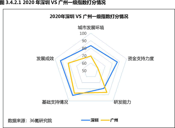深圳人工智能發展總指數得分為86.52分,廣州得分77.74分,分別占據全 國人工智能發展城市第三位和第六位。雖然深圳有深圳大學、南方科技大學等G校 資源,但廣州整體研發能力更勝一籌,杰出人才總量、論文產出數量均相對L先。 雖然廣州研發能力較強,但整體實力上與深圳相比還存在一定差距,尤其是城市發 展環境、資金支持力度和發展成效上均不及深圳。