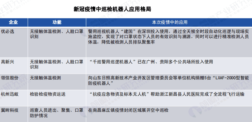 新G疫情中,防疫機器人在巡檢L域主要企業有優必選、G新興、L信股份、翼眸科技等企業,其防疫機器人產品主要應用于疫情防護中的無接觸體溫檢測、人臉口罩識別等工作。