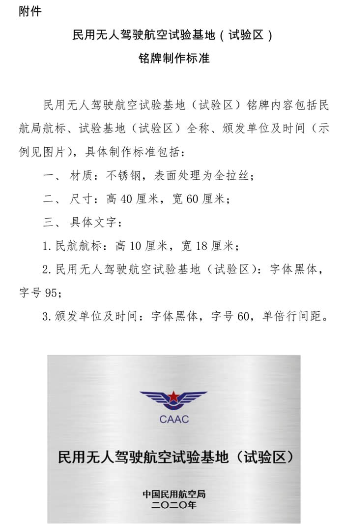請(qǐng)批民用無人駕駛航空試驗(yàn)基地(試驗(yàn)區(qū))所屬地方政府結(jié)合本地實(shí)際,按照各自目標(biāo)定位,進(jìn)一步加強(qiáng)工作推進(jìn),完善運(yùn)行管理機(jī)制,落實(shí)重點(diǎn)任務(wù),做好試驗(yàn)基地(試驗(yàn)區(qū))建設(shè)和運(yùn)行相關(guān)工作,試出成效、確保安全;并按照統(tǒng)一標(biāo)準(zhǔn)自行制作試驗(yàn)基地(試驗(yàn)區(qū))銘牌(標(biāo)準(zhǔn)見附件2) 。