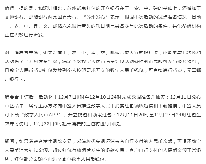 根據“蘇州發布”,此次“雙12蘇州購物節”數字人民幣消費紅包將采取“搖號抽簽”形式發放,非先到先得,無需爭搶。抽簽報名通道自2020年12月5日0時正式開啟,持續至12月6日24時。