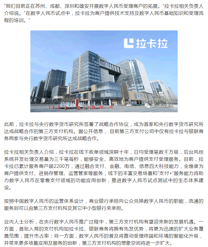 據了解,作為開通數字人民幣受理服務的支付機構,此次拉卡拉參與蘇州雙十二活動的商戶門店數近千家,包括全國知名連鎖藥店,商超,化妝品店,餐飲店,酒店,連鎖美甲店,汽配店等。此次蘇州數字人民幣消費紅包測試支持掃一掃、碰一碰(雙離線)等非接觸支付方式。