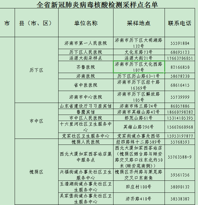 山東省衛生健康委公布全省2044家新冠肺炎病毒核酸檢測采樣點名單,濟南市第一人民醫院 歷下區人民醫院 濼源大街采樣點 齊魯醫院 濟南醫院 省中醫醫院 濟南市中心醫院