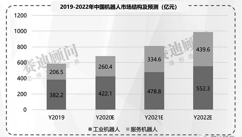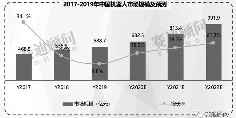 2019年,機器人市場規模持續增長,達588.7億元,增長率為9.8%,預計到2022年,市場規模將達到991.9億元,2020-2022三年復合增長率為19.0%。