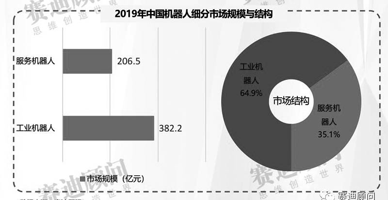 2019年,服務機器人市場規模為206.5億元,占整體機器人市場規模的35.1%,所占比例進一步提G,工業機器人市場規模為382.2億元,占比為64.9%。
