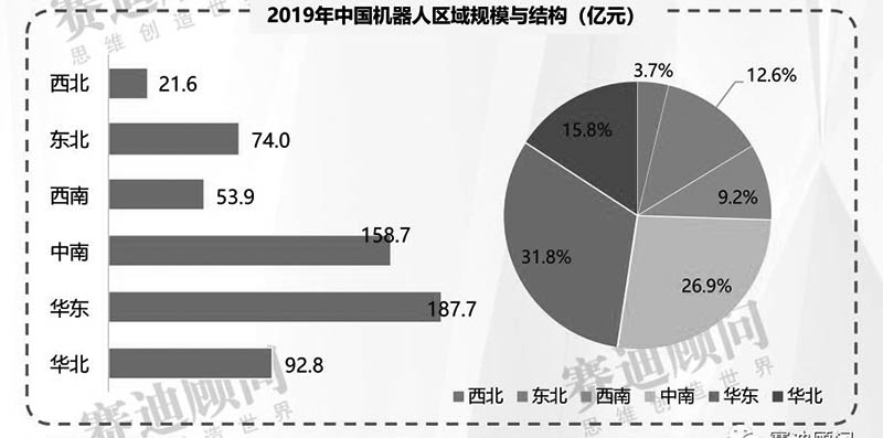 2019年,華東、中南、華北地區是機器人發展較好的區域市場,市場份額分別達到31.8%、26.9%和15.8%。隨著機器人的應用場景不斷擴大與滲透,東北、西南、西北地區機器人市場規模呈現增長趨勢,市場份額將進一步提升。
