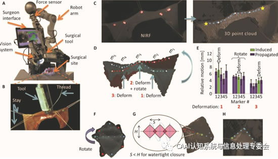 自動化是手術(shù)機器人的重要發(fā)展方向,在醫(yī)療L域由于其特殊性目前自動化的程度相對于工業(yè)、服務(wù)以及特種L域均較低。目前機器人輔助手術(shù)(RASs)的模式完全取決于單個外科醫(yī)生的手動能力。自動機器人手術(shù)可以保證手術(shù)效率和安全性的提G,并改善優(yōu)化手術(shù)技術(shù)。由于技術(shù)上的限制,涉及軟組織的手術(shù)尚未d立進行,包括缺乏能夠在動態(tài)手術(shù)環(huán)境中識別和跟蹤目標組織的視覺系統(tǒng),以及缺乏能夠執(zhí)行復(fù)雜手術(shù)任務(wù)的智能算法。美國約翰霍普金斯大學(xué)[3]通過增強視覺、靈巧性和互補的機器智能來改善手術(shù)效果、安全性,實現(xiàn)軟組織變形的自動跟蹤、監(jiān)測以及吻合。通過實驗證明,自主機器人可以提G手術(shù)的效率、一致性、功能結(jié)果和可行性。