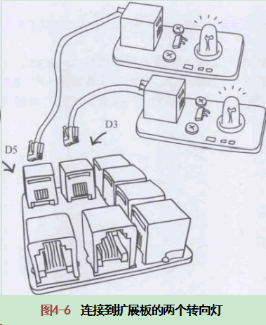 將機器人、擴展板和小燈模塊連接好,將右轉向燈連接D5 號口,左轉向燈連接D3號口,如圖4-6所示。