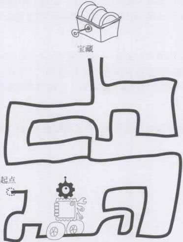 要用黑膠帶制作一幅迷宮地圖,如圖10-3所示。在迷宮的出口處 用一個障礙物當(dāng)作“寶藏”。然后,我們機(jī)器人的任務(wù)就是順利通過迷宮并且停在“寶藏” 前面。這里先來處理一個簡化的問題,假設(shè)迷宮的地圖是已知的,也就是說,機(jī)器人知道應(yīng)該向什么方向,轉(zhuǎn)幾次彎才能走出迷宮。