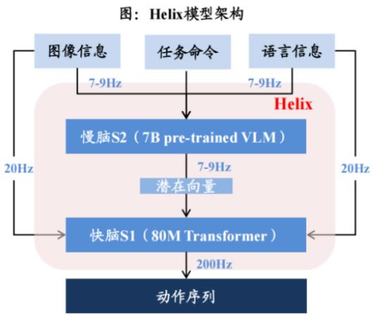 ●架構(gòu)&輸出:采用端到端的快慢腦架構(gòu),輸出200Hz 動(dòng)作序列。Helix采用一個(gè)7B 參數(shù)量的預(yù)訓(xùn)練 VLM 作為慢腦,以及一個(gè)80M 參數(shù)量的Transformer模型作為快腦。兩個(gè)模型解耦,在實(shí)際應(yīng)用中 以不同頻率同時(shí)處理圖像及語(yǔ)言訊息,慢腦負(fù)責(zé)思考高層目標(biāo),并以潛在向量指揮快腦,快腦負(fù) 責(zé)實(shí)時(shí)執(zhí)行和調(diào)整動(dòng)作,并輸出200Hz動(dòng)作序列。同時(shí)由于潛在向量的存在,快慢腦可進(jìn)行梯度 回傳,從而兩者構(gòu)成一個(gè)整體的端到端模型。