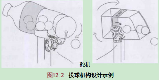 下面就來制作機(jī)器人的運(yùn)貨機(jī)構(gòu)。請(qǐng)同學(xué)們用1~2個(gè)舵機(jī)做它的驅(qū)動(dòng)器,然后盡量 用硬紙板、礦泉水瓶等生活中常見的材料制作一個(gè)高效的貨倉(cāng)。 貨倉(cāng)機(jī)構(gòu)是比賽取得高分的關(guān)鍵,它應(yīng)該非常便于快速地裝載乒乓球貨物,又能準(zhǔn) 確、迅速地把貨物投放到卸貨塔里去。越大的貨倉(cāng)意味著能一次運(yùn)送越多的貨物,不過同 時(shí)它的自重很大也會(huì)影響機(jī)器人的發(fā)揮。制作一個(gè)好的貨倉(cāng)往往需要多次的實(shí)驗(yàn)嘗試, 請(qǐng)同學(xué)們自己去動(dòng)手試試看。圖12-2中演示了兩種不同的制作貨倉(cāng)裝置的思路。