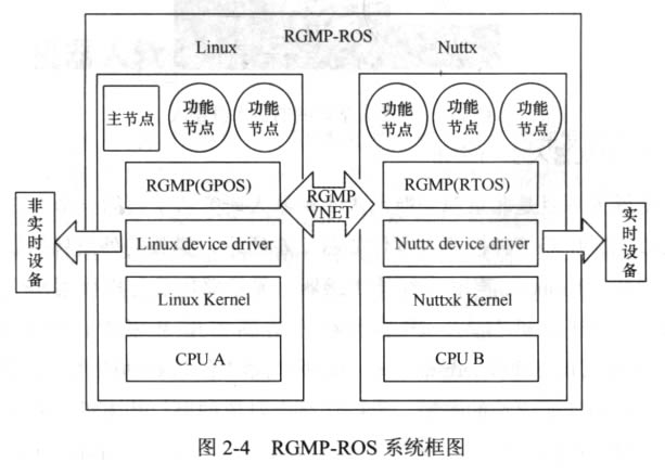 RGMP-ROS的系統框圖如圖2-4所示,整個機器人混合操作系統由兩個部分組 成:一個是安裝在Linux 上的標準ROS 系統,另一個是運行在實時操作系統Nuttx 上的實時ROS 系統。我們將運行在Linux 上的ROS 功能節點稱為非實時ROS 節點, 運行在實時系統上的ROS 節點稱為ROS 實時節點,它們運行在各自的操作系統之 上。實時與非實時節點之間通過RGMP 提供的VNET 管道進行通信。實時ROS 節 點運行在Nuttx 之上,能夠通過標準的ROS 通信協議實現實時節點與實時節點、實 時節點與非實時節點之間的通信,并且傳遞符合ROS 協議規范的消息。實時節點 通過Nuttx 驅動與Nuttx 系統內核和實時系統掛載的外部設備進行交互,以達到控 制實時設備的目的。為了保證實時性,GPOS 與 RTOS 各自擁有d立的外設。