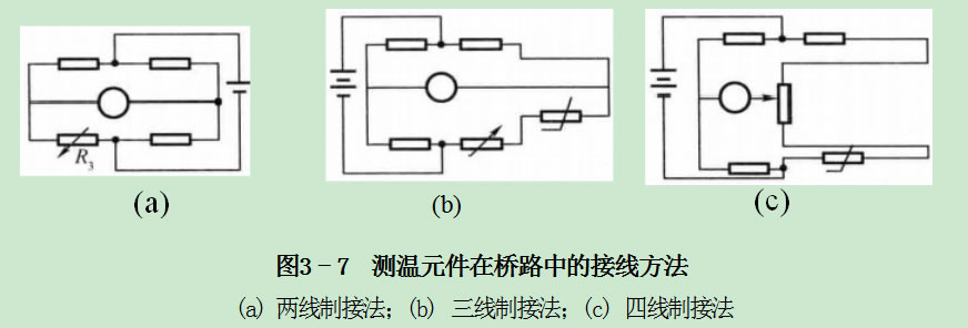 測溫元件在工業測量中多采用兩線制和三線制接法,在實驗室多采用四線制接法。兩線制接法如圖3-7 (a) 所示,熱電阻傳感器的感溫元件用兩根引出線,引出線的電阻值越小越好。