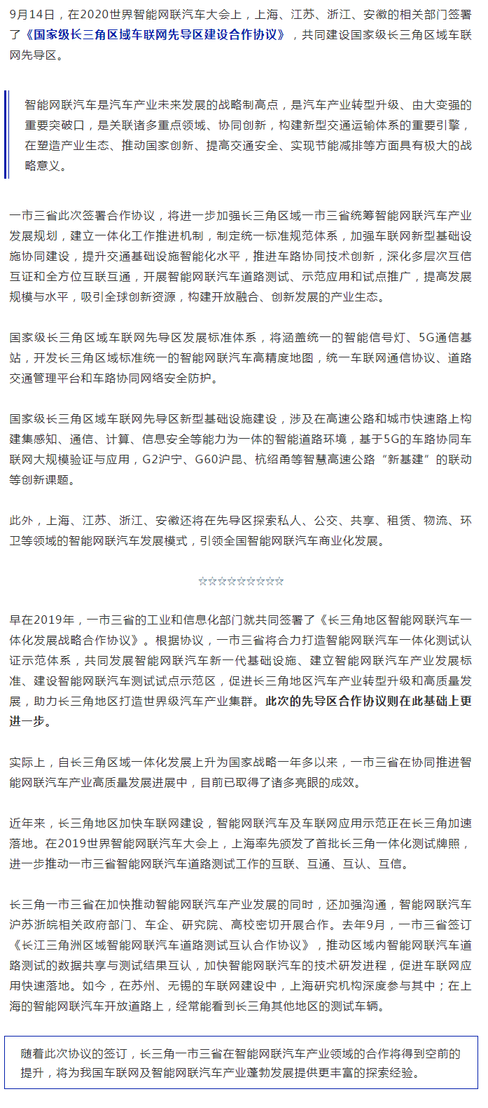 9月14日,上海、江蘇、浙江、安徽一市三省共同簽署《長三角區域車聯網先導區建設合作協議》,將深化多層次互信互證和全方位互聯互通,開展智能網聯汽車道路測試、示范應用和試點推廣,合力打造長三角區域車聯網先導區。