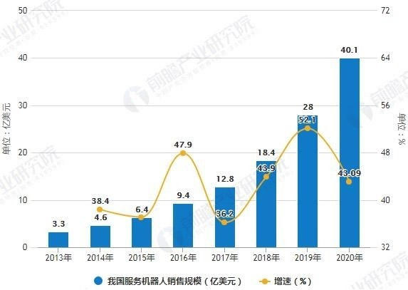 隨著人工智能技術(shù)的發(fā)展,我國(guó)服務(wù)機(jī)器人市場(chǎng)也迎來(lái)了爆發(fā)式增長(zhǎng),據(jù)前瞻產(chǎn)業(yè)研究院發(fā)布的《中國(guó)服務(wù)機(jī)器人行業(yè)發(fā)展前景與投資戰(zhàn)略規(guī)劃分析報(bào)告》統(tǒng)計(jì)數(shù)據(jù)顯示,2013-2018年整體處于飛速增長(zhǎng)階段,2018年中國(guó)服務(wù)機(jī)器人市場(chǎng)規(guī)模有望達(dá)到18.4億美元,同比增長(zhǎng)約45.3%,G于服務(wù)機(jī)器人市場(chǎng)增速。